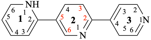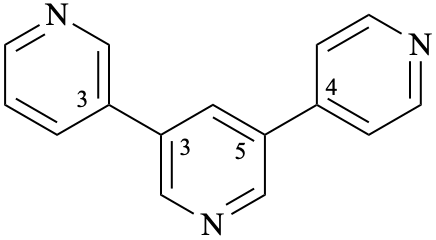 (not 13,25:23,34-terpyridine); both locant sets are the same but 13,23:25,34 is lower than 13,25:23,34 in the order of citation. 3,3′:5′,4′′-terpyridine (not 3,5′:3′,4′′-terpyridine both locant sets are the same but 3,3′:5′,4′′ is lower than 3,5′:3′,4′′ in the order of citation. |